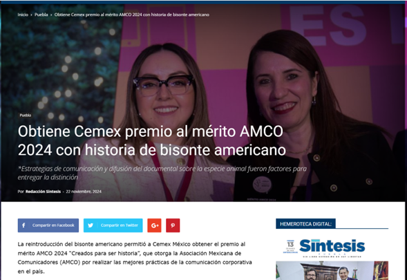 Obtiene Cemex premio al mérito AMCO 2024 con historia de bisonte americano